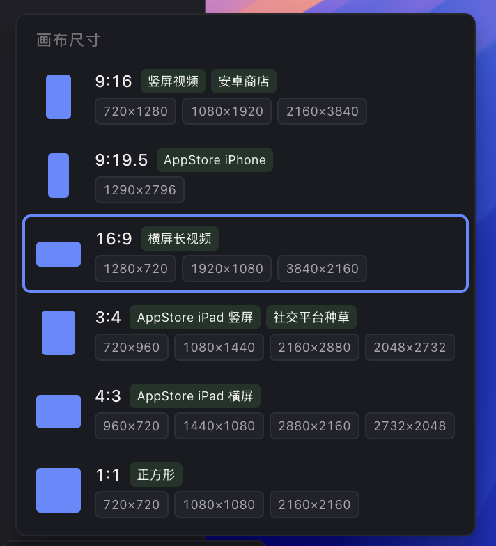 7 、支持各种画布比例,AppStore 、安卓应用商店、社交媒体种草等,视频和图片都可导出